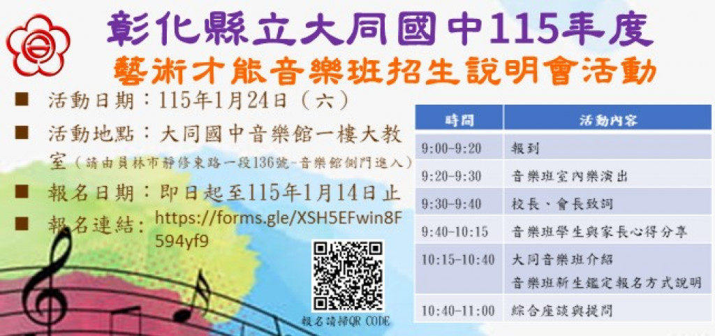 | 二、 | 配合彰化縣縣府簡章公告,大同國中於115年3月18日(三)~3 月20日(五) 上午9時至下午4時於輔導室辦理藝術才能「音樂班」新生鑑定報名作業。 |