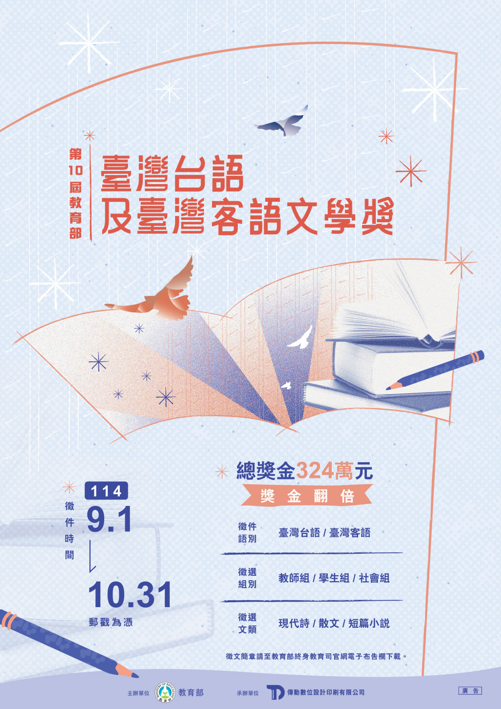 三、 首揭文學獎徵稿期程自114年9月1日起至10月31日止,活動新聞稿、簡章及海報,請參見附件。另有關旨揭文學獎歷屆得獎作品集,已公布在「教育部語文成果網」(https://language.moe.gov.tw/)—「語文推廣類」—「臺灣本土語言文學獎」單元項下。