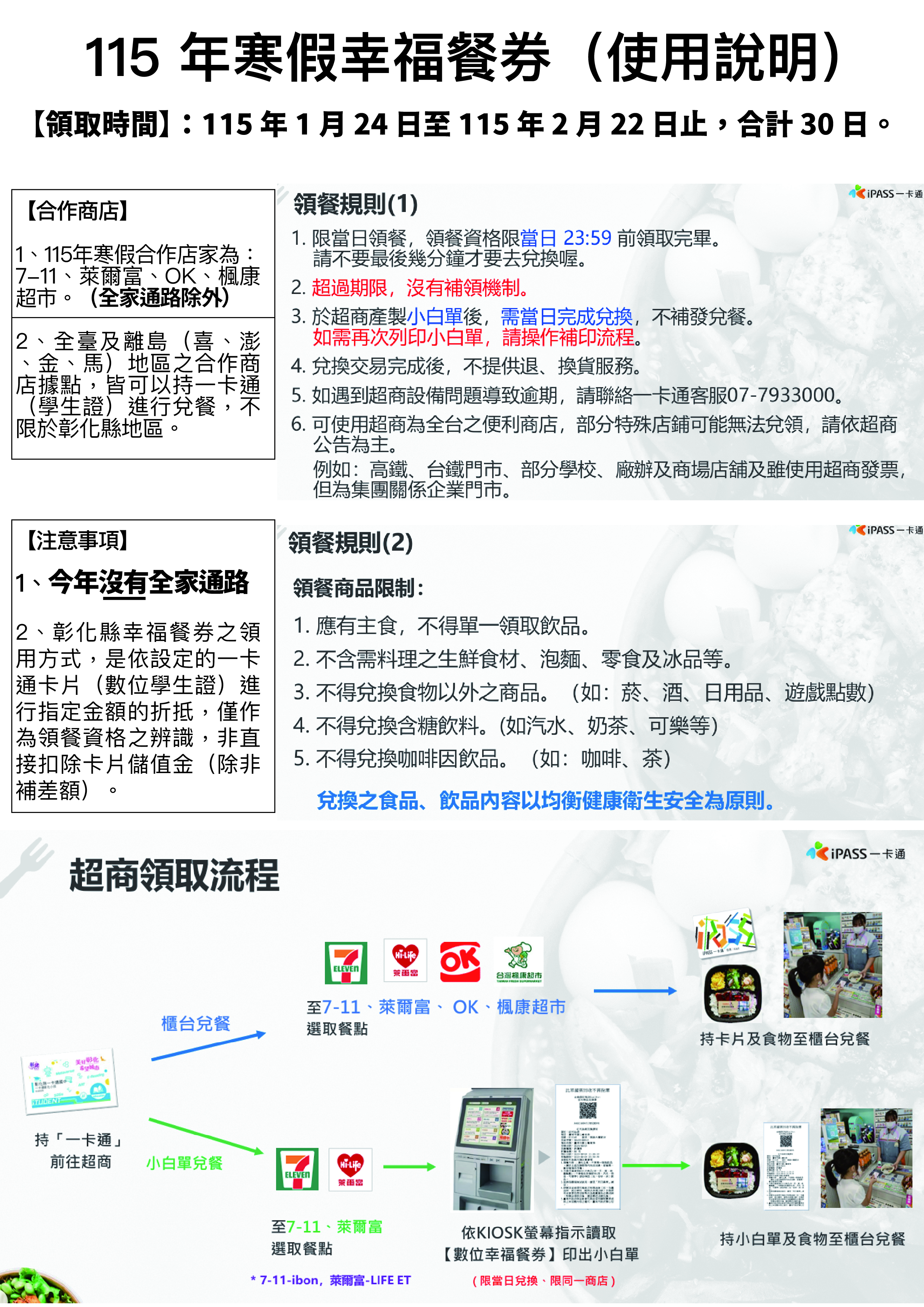 2、全臺及離島(臺、澎、金、馬)地區之合作商店據點,皆可以持一卡通(學生證)進行兌餐 不侷限於彰化縣地區。