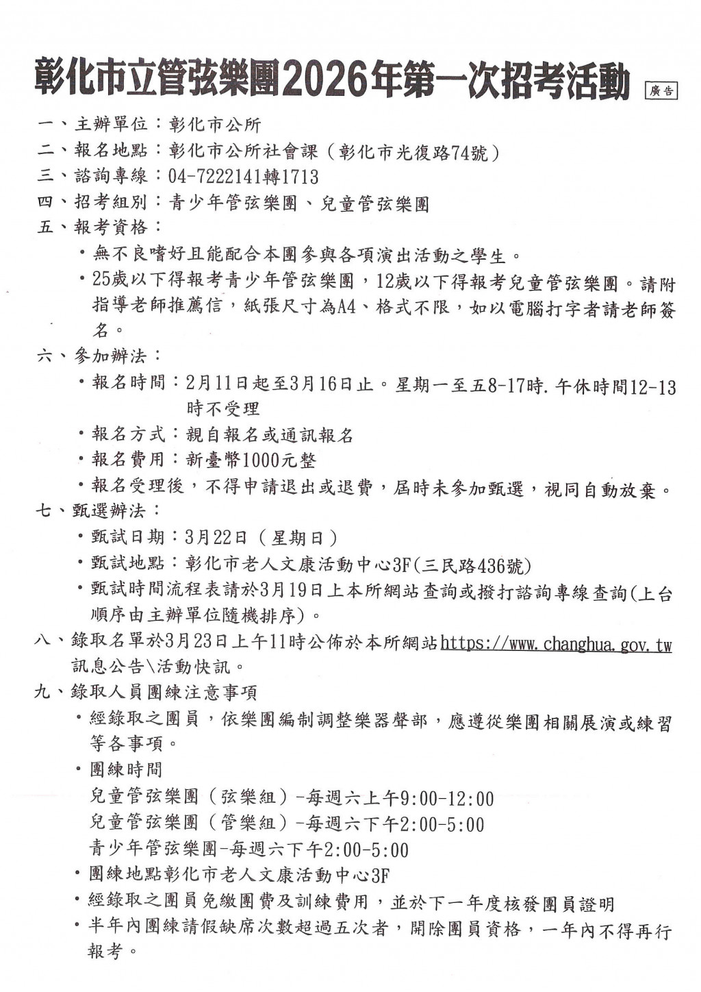 轉知:彰化市立管弦樂團2026年第一次招考團員活動簡章1份,請查照。