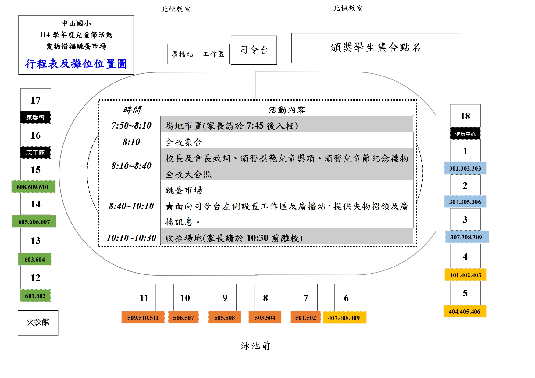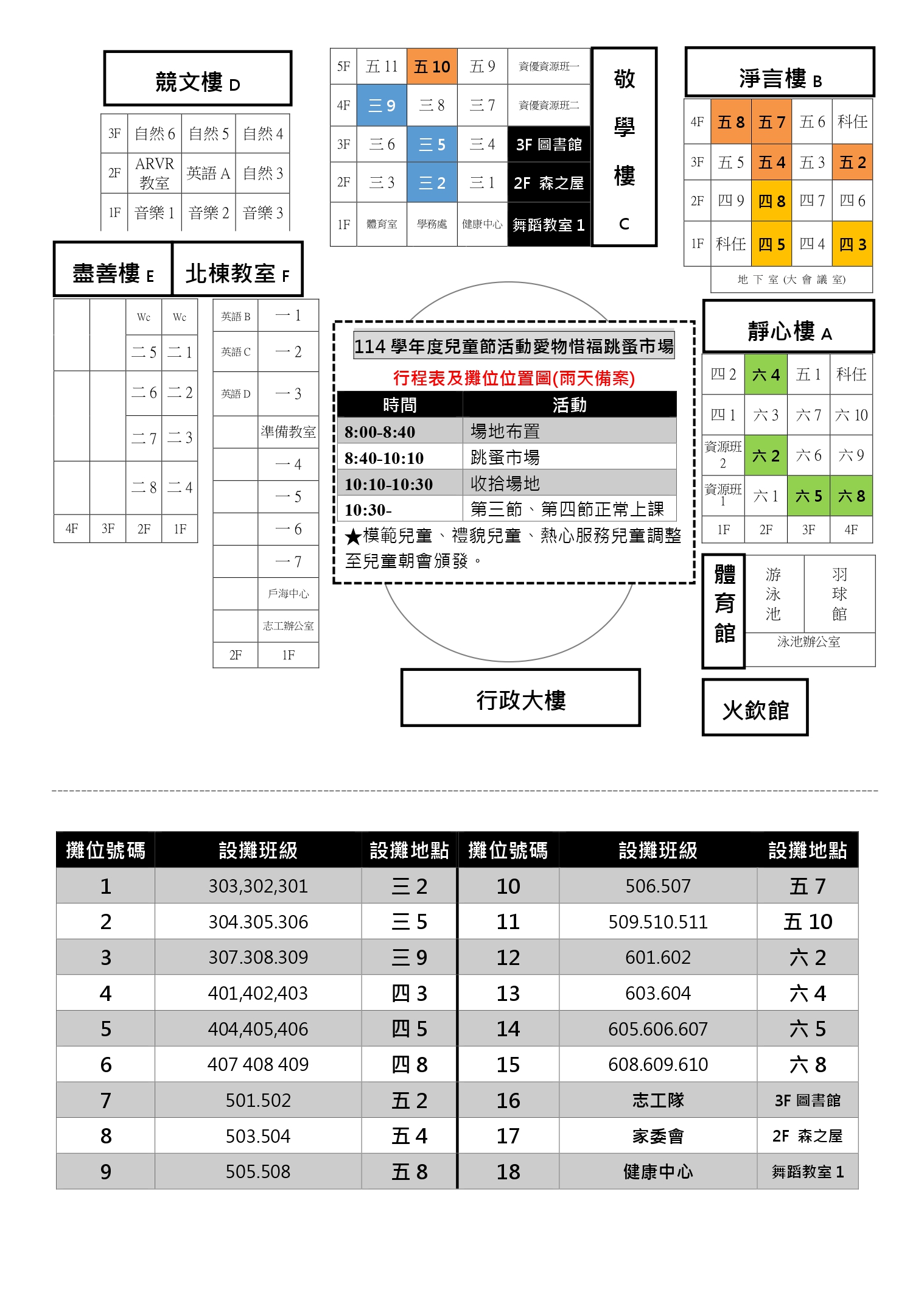 因應4/1(三)可能下雨的彈性措施 1_晴天版:原本設置操場的攤位全數調整至紅磚道,避免草地泥濘。 2_雨天版:頒獎調整至兒童朝會頒發;班級攤位調整至班級教室前面/走廊,健康中心、志工隊、家委會調整至敬學樓的空地廣場。 3_請參閱附件圖表