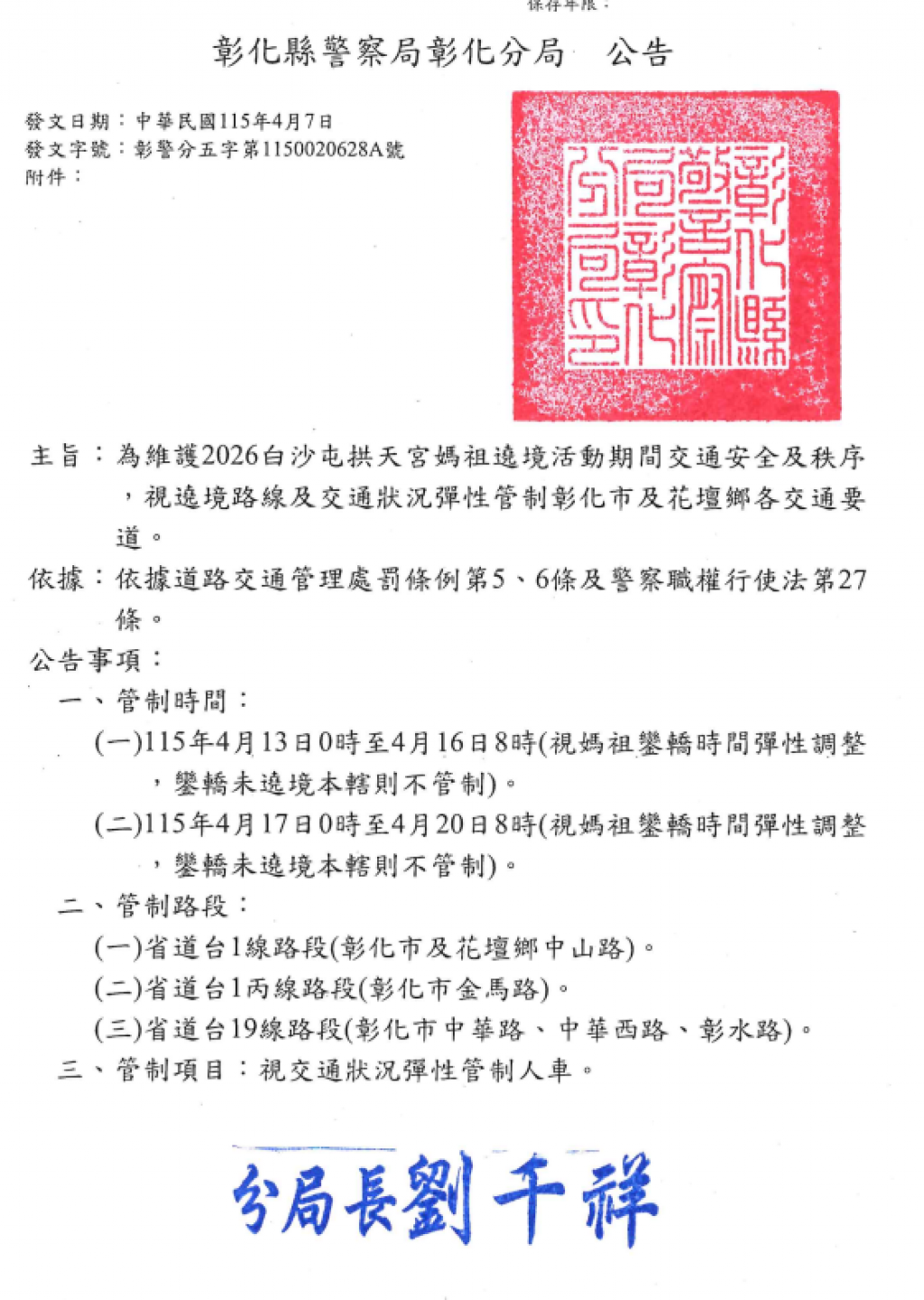 轉知:彰化縣警察局「2026白沙屯拱天宮媽祖遶境活動」交通管制公告