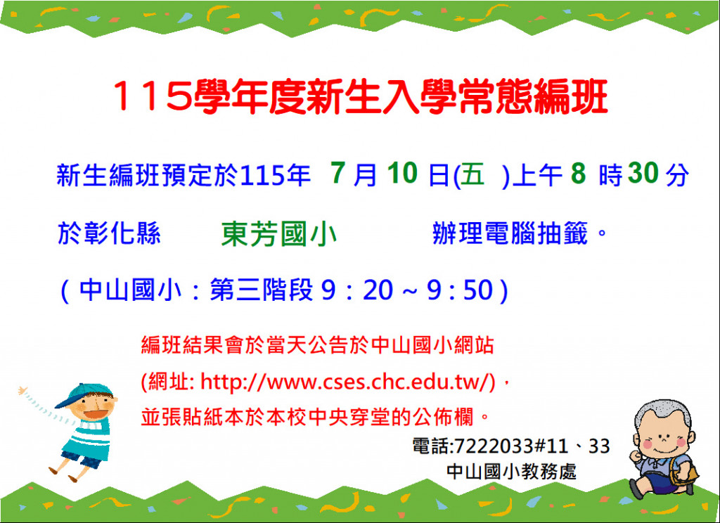 中山國小新生編班結果於當天中午公告於中山國小校網,並張貼紙本於本校中央穿堂的公布欄。