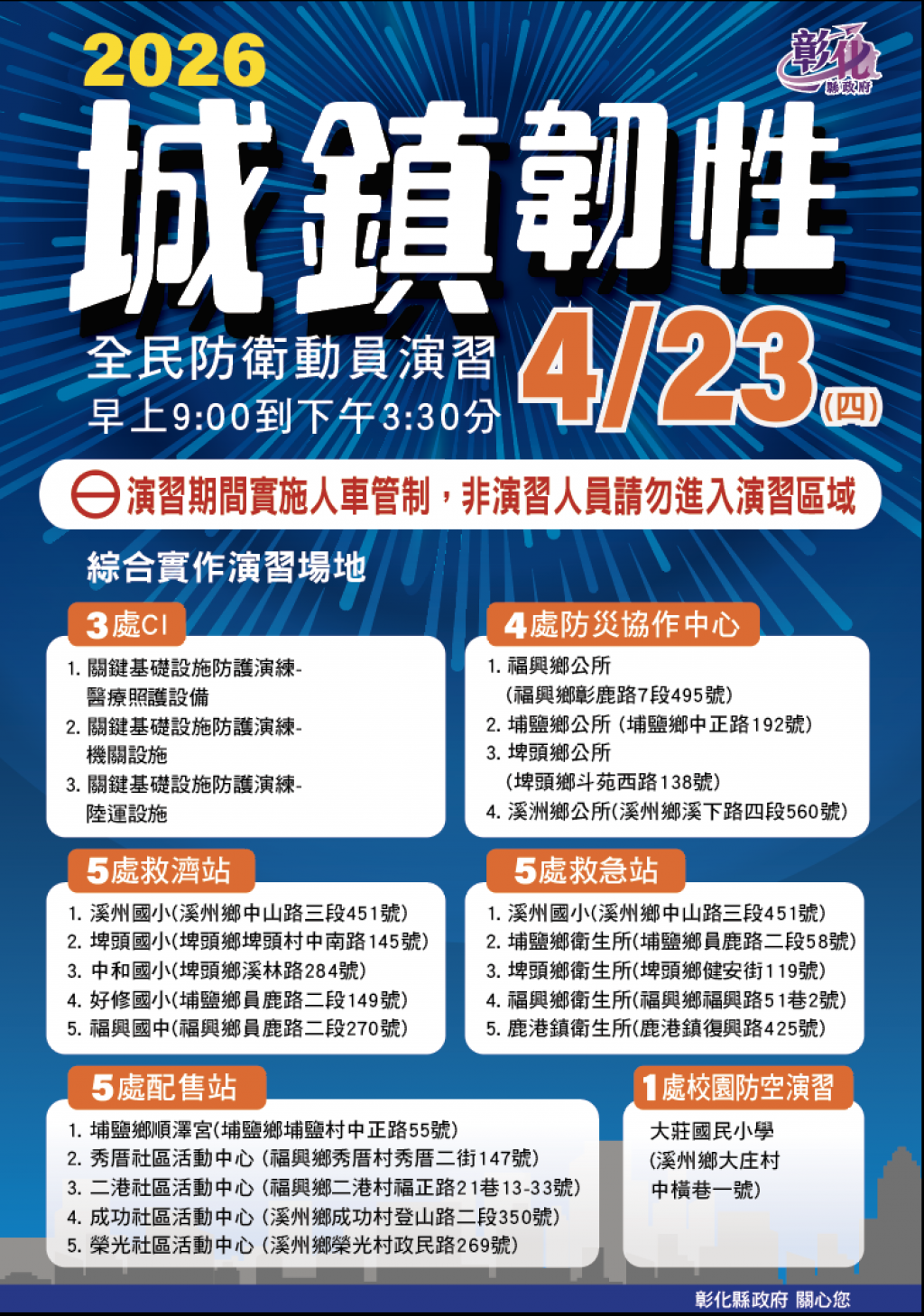 辦理彰化縣2026城鎮韌性(全民防衛動員)演習。