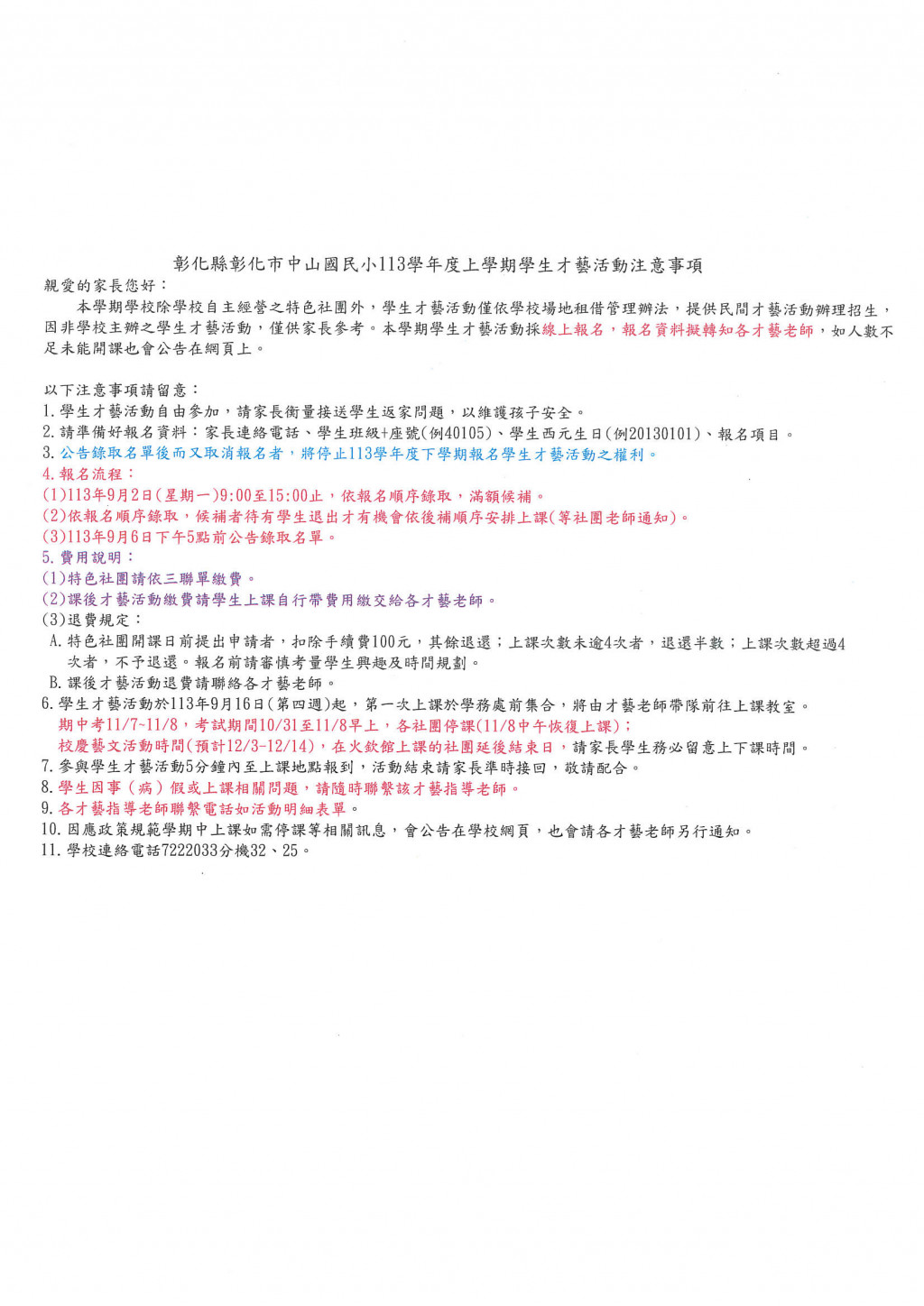 中山國小113學年度上學期學生課後才藝活動-錄取名單如附件